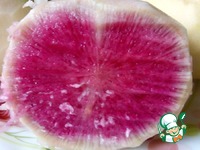 - выбираем специально розовую редьку, т. к. она не горькая, очень сочная и яркая, отчего салат получается нарядным; |