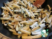 В воке или глубокой сковороде, можно в казане разогреть на среднем огне растительное масло. Обжарить нарезанные брусочками баклажаны до золотистого цвета. |