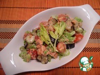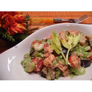 Описание: Баклажаны и помидоры - это одно из самых лучших вкусовых сочетаний! А если к ним добавить еще красную рыбку и сельдерей, то получится очень оригинальный салат!