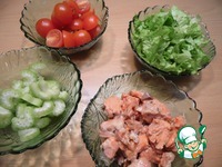 Сельдерей нарезать небольшими кусочками, залить соком лимона, оставить на 10 минут. Из рыбы слить жидкость, наломать ее на небольшие кусочки. Салат нашинковать, черри нарезать половинками. |