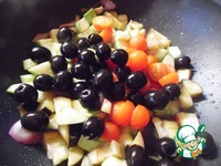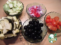 Цуккини и баклажан нарезать кубиками, лук - полукольцами, чили - колечками, черри - половинками. Из маслин слить жидкость. |