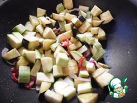 К луку и чили добавить цуккини и баклажан, обжарить 7-9 минут. |