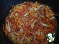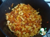 Морковь, лук измельчаем. На дно кастрюли с толстым дном наливаем масло и обжариваем овощи до золотистого цвета. Потом я добавляю яблоко, порезанное соломкой, оно придаёт пикантность блюду. |