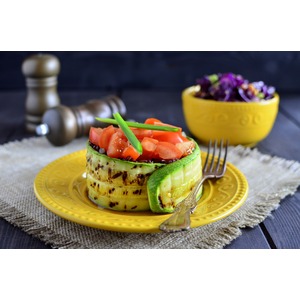 Сервировать блюдо. В кулинарное кольцо выложить 2 слайса грилованного кабачка. |