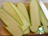 Кабачки нарезать на слайсы (боковинки не берем), я сделала 6 слайсов, на сервировку 3 порций. Остальные порезала кубиками. |