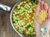 Зальем бульоном. Когда вода закипит, добавим пасту орзо. Варим на небольшом огне 15 минут. Посолим в процессе готовки. |