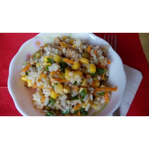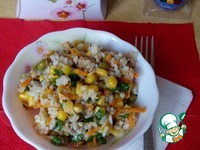 - добавляем кукурузу и горошек, тщательно перемешиваем. За счет сока консервы и подсолнечного масла в поджарке салат получается сочным. Подсаливаем и перчим по вкусу. Салат готов. |