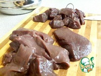 Промыть печень под прохладной водой. Очистить от пленок, прожилок. Нарезать на кусочки ( не более 1 см) |