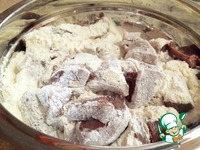 Слить молоко. Обсушить кусочки бумажным полотенцем. Обвалять каждый кусочек в муке. |