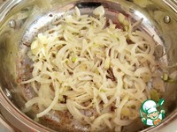 На этом же масле обжарить полукольцами лук, до золотистого цвета. |