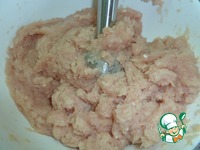 Остатки молока добавить в куриный фарш. Фарш посолить и пробить погружным блендером. |