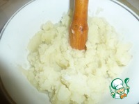 Когда картофель сварился, надо его растолочь. Затем в толчёнку добавляем немного воды, в которой она варилась. Выкладываем толчёнку и порезанный картофель в овощной бульон и ставим варится. |