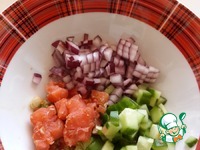 Нарежьте мелко слабосоленую семгу, свежий огурец и красный лук. |