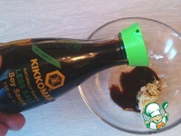 Для заправки смешайте измельченный чеснок, соевый соус "Киккоман", лимонный сок, оливковое масло. |
