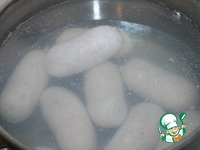 Вскипятить в кастрюле воду и опустить колбаски в кипяток, довести воду с колбасками до кипения, затем огонь убрать до минимального и варить при слабом кипении 40 минут. |