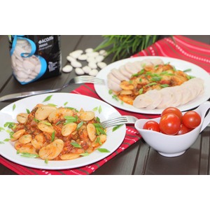 Описание: Гигантес яхни, это греческое рагу с местной огромной фасолью. У нас такой фасоли нет, но есть фасоль лима ТМ Мистраль, так называемая сливочная фасоль. Блюдо невероятно вкусное, яркое. Вкусно как в горячем, так и холодном виде. Как основное блюдо, как гарнир или как холодная закуска. А для тех, кто Пост не соблюдает мы подадим это рагу с куриными домашними колбасками.