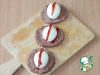 15. В оставшиеся 3 лепешки кладем половину вареного яйца, немного перчика чили и формируем зразы. Обваливаем зразы в сухарях и жарим с двух сторон. |
