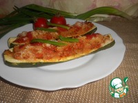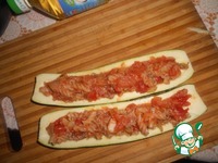 Заполнить полученные "лодочки" из цуккини полученной начинкой, выложить в огнеупорную форму и запекать при температуре 200 градусов в течении 25 минут. |