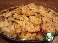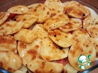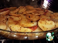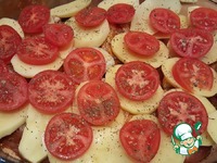 Закрываем слой помидоров, ещё одним слоем картошки и намазываем картофель остатками маринада. |