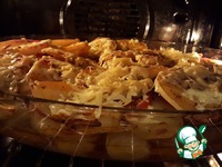 Через час запекания, достаём форму и посыпаем сверху небольшим кол-вом тёртого сыра. Можно этого не делать, но нам так ещё вкуснее. |