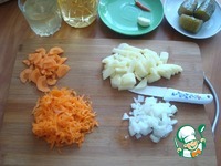 Огурцы натираем на тёрке. Отправляем в кастрюлю. Варим их в рассольнике минут 10, они маринованные. |