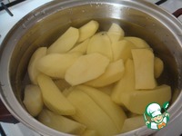 Картофель очистить. Если картофель крупный то порезать (не мелко), если небольшой то можно оставить целиком. Залить водой, посолить и сварить до полуготовности. |