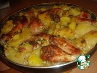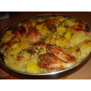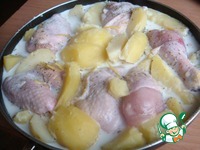 Между кусками курицы распределить картофель. Влить молоко так, чтобы наше содержимое почти полностью покрыло. |