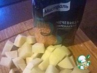 Картофель крупно порезать Воду поставить на плиту. Добавить в нее овощи, соль и чечевицу Варить до готовности картофеля (минут 20) Постную основу разделить пополам |