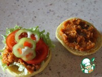Теперь берем булочки, разрезаем их вдоль, кладем лист салата, сверху пару ложек чечевичного соуса. |