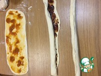 Раскатать тесто длинными широкими полосками, на каждую нанести начинку, аккуратно, оставляя у одного длинного края 0,5 см для защипа |