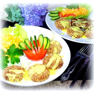 Непостное блюдо. Фасолевые биточки с котлетой под соусом с салатом. |
