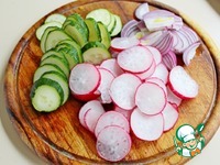 Огурец и редис нарезать тоненькими кружочками, лук -перьями. |