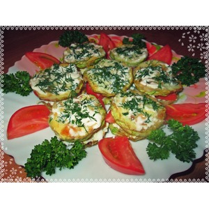 7. Теперь собираем нашу закуску: берём кружок кабачка, смазываем его чесночным майонезом, посыпаем яйцом, сверху- помидорчик, на него опять кружок кабачка, смажем и его чесночным майонезом и посыплем укропом. Так поступать и с остальными кружочками кабачков. Получается безумно вкусно! Приятного аппетита!