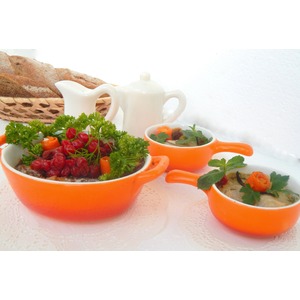 Нарезаем филе на кусочки и обмакивая в смесь, выкладываем в керамическую посуду для запекания |