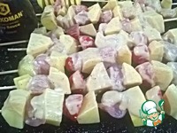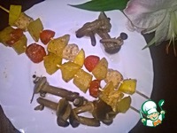 В одном шашлычке и птица и гарнир. Очень удобно. В процессе приготовления все вкусы смешиваются и овощи пропитываются куриным ароматом!