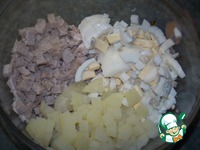 Свинину, картофель и яйца отварить. Порезать кубиком |