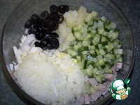 Лук слить, маслины порезать колечками. Огурец порезать кубиком. Все перемешать, добавить соль и перец, заправить майонезом. |
