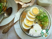 Непостящейся половине я в тарелку выложила яйцо вкрутую и добавила майонез. Положила резанный, зелёный лук. |