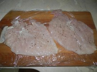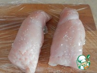 Выкладываем на пленку куриное филе и сверху покрываем еще пленкой. Хорошенько отбиваем. |