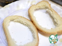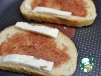 На сковороду укладываем целые кусочки батона маслом вниз. Мажем кетчупом, по бокам кладем тоненькие брусочки брынзы (можно по всему периметру) |