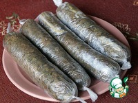 Выкладывать фарш на пищевую пленку, придавая форму колбасок длиной примерно 15-20 см (чтобы колбаски поместились в кастрюлю), заворачивать слоев в 10. |