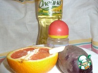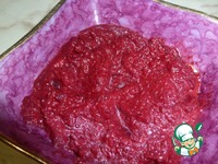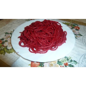 Готовим заправку для спагетти. Для этого надо выдавить апельсиновый сок, добавить зубчик чеснока,1ч. л. масла растительного и порезанную свеклу. Всё измельчаем блендером. |