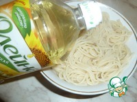 Варим спагетти в подсоленной воде. Когда они сварились, сливаем воду и чуть заправляем растительным маслом. |