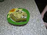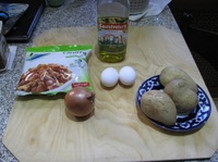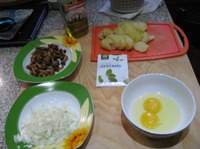 Отварную картошку очистить, нарезать кружочками. Лук мелко нарезать. грибы отварить. Яйца взбить. |