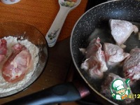 Курицу разрезать на небольшие куски, обвалять в муке, обжарить на сильном огне до румяной корочки и выложить в ёмкость с высокими бортиками. |
