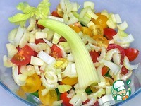 Заправила салат маслом, выжала сок лимона, добавила уксус и хорошо перемешала. Салат разделила на две части. |