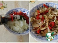 В чашку наливаем томатный сок, добавляем соевый соус (4 ст. л.) и щепотку розмарина. Перемешиваем. Маринад готов. |