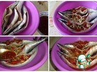Рыбу моем, очищаем от внутренностей. Выкладываем в чашку брюшком вверх. Внутрь брюшка каждой рыбки кладем подготовленную овощную начинку. Добавляем маринад. Оставляем на 20-30 минут. |
