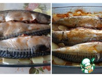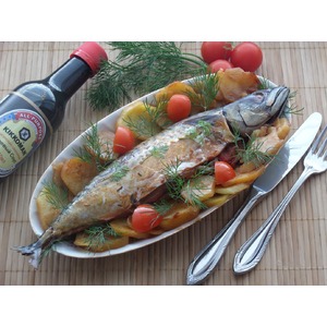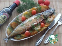 Поверх картофеля выкладываем рыбу. Накрываем форму фольгой. Ставим в разогретую духовку и запекаем 45-55 минут при 150 градусах. За 5 минут до окончания запекания снимаем фольгу. |