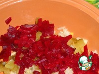 Добавить мелко порезанную свеклу. Перемешать. Заправить салат подсолнечным маслом. Посолить по вкусу. |